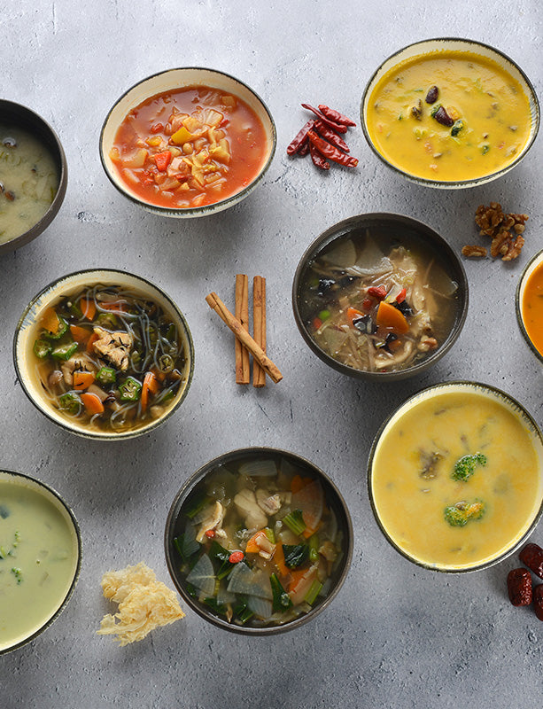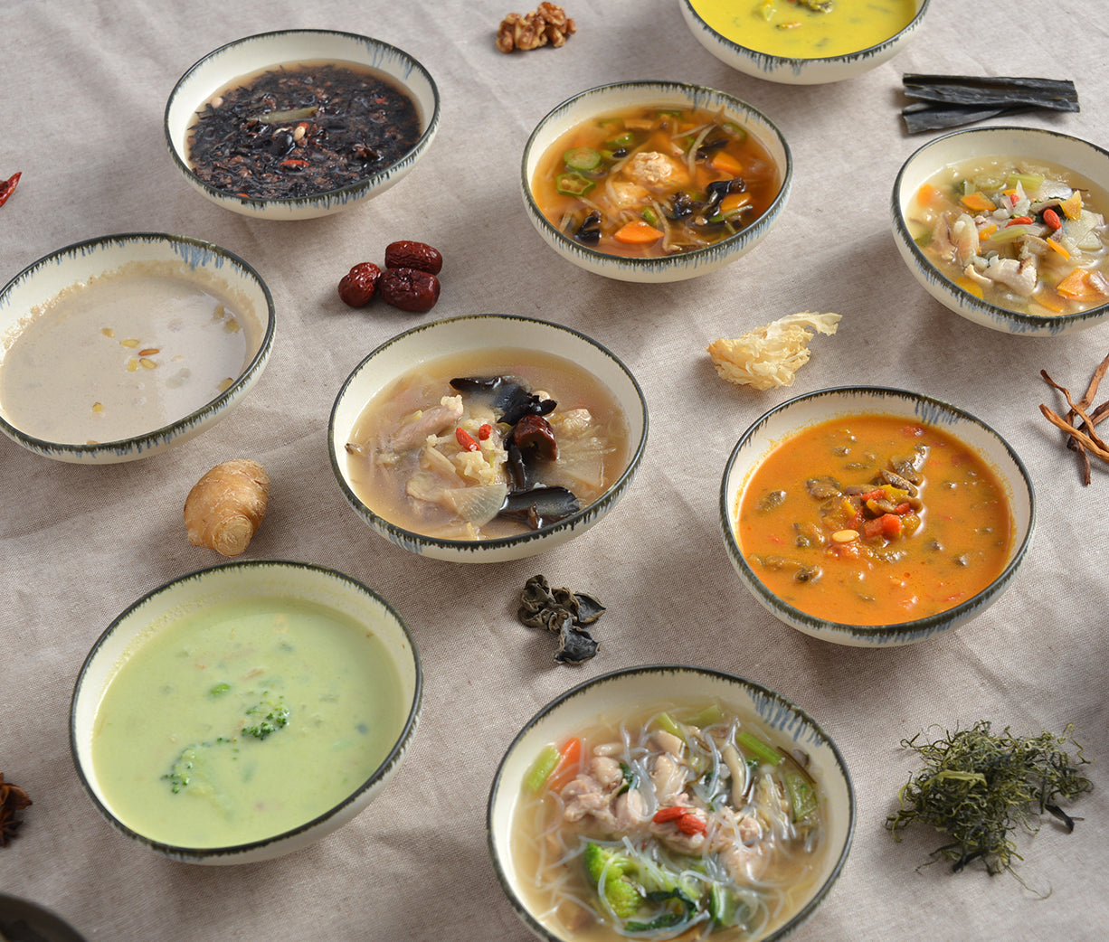 忙しいときにも、美味しいスープで体を整えてほしい。無理せず簡単に食事を楽しんでほしい。安心を冷凍庫にストックしてほしい。そんな思いからこうじやのスープは生まれました。自家製糀の発酵の力をプラス。塩糀、しょうゆ糀、甘酒をすべてのスープに加えました。